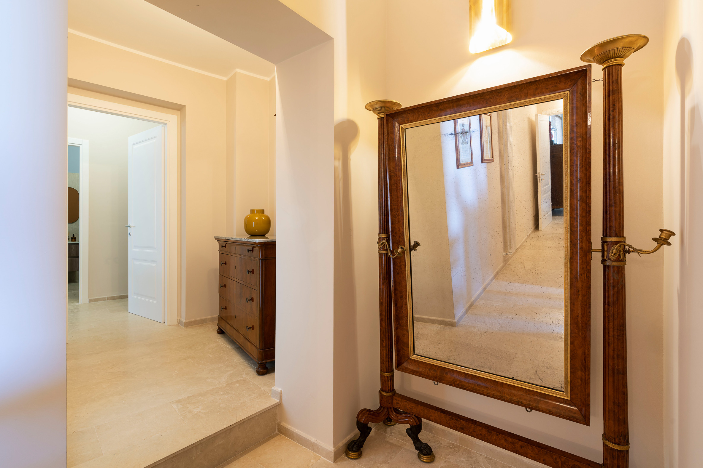 Gli accoglienti ambienti interni, arredati con particolare cura e dotati dei migliori comfort, dispongono di riscaldamento e aria condizionata (in tutti gli ambienti), Wi-Fi, 5 TV, ricevitore satellitare, lavatrice, asciugatrice, 2 lavastoviglie, forno elettrico, microonde e cantinetta. Al secondo piano, accessibile tramite ascensore, si trovano un ampio salotto, un bagno di servizio, due camere da letto con bagno-doccia e la camera padronale con letto king size, guardaroba e bagno con vasca. Al piano superiore si trovano una ben accessoriata cucina e la quarta camera da letto con bagno-doccia.