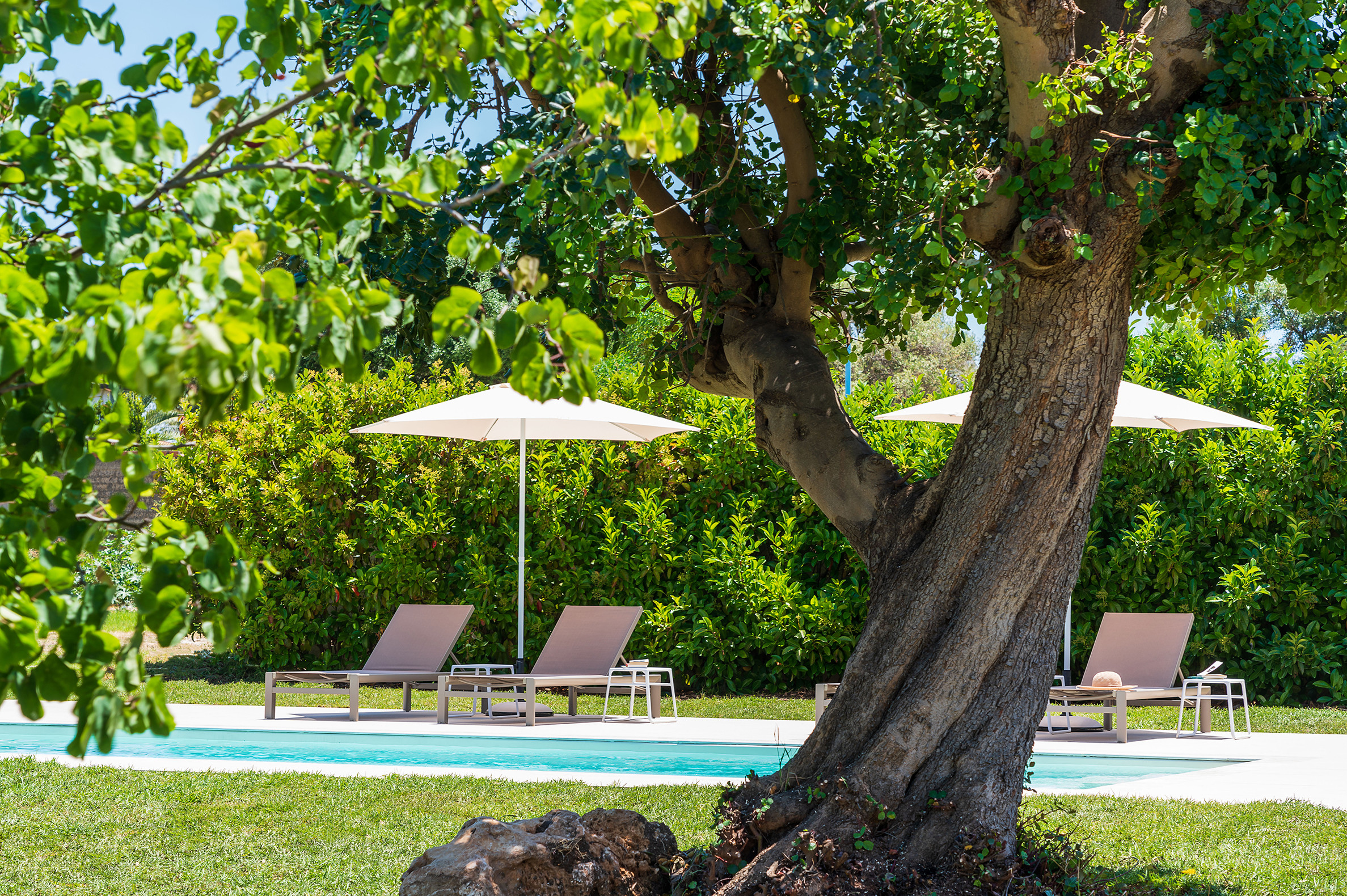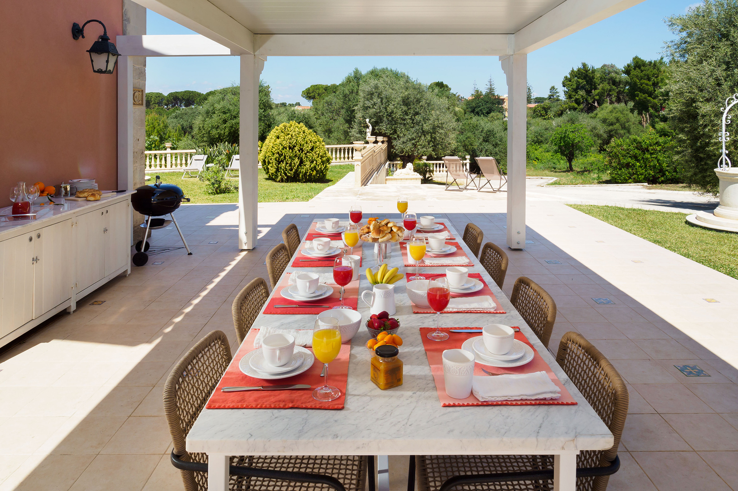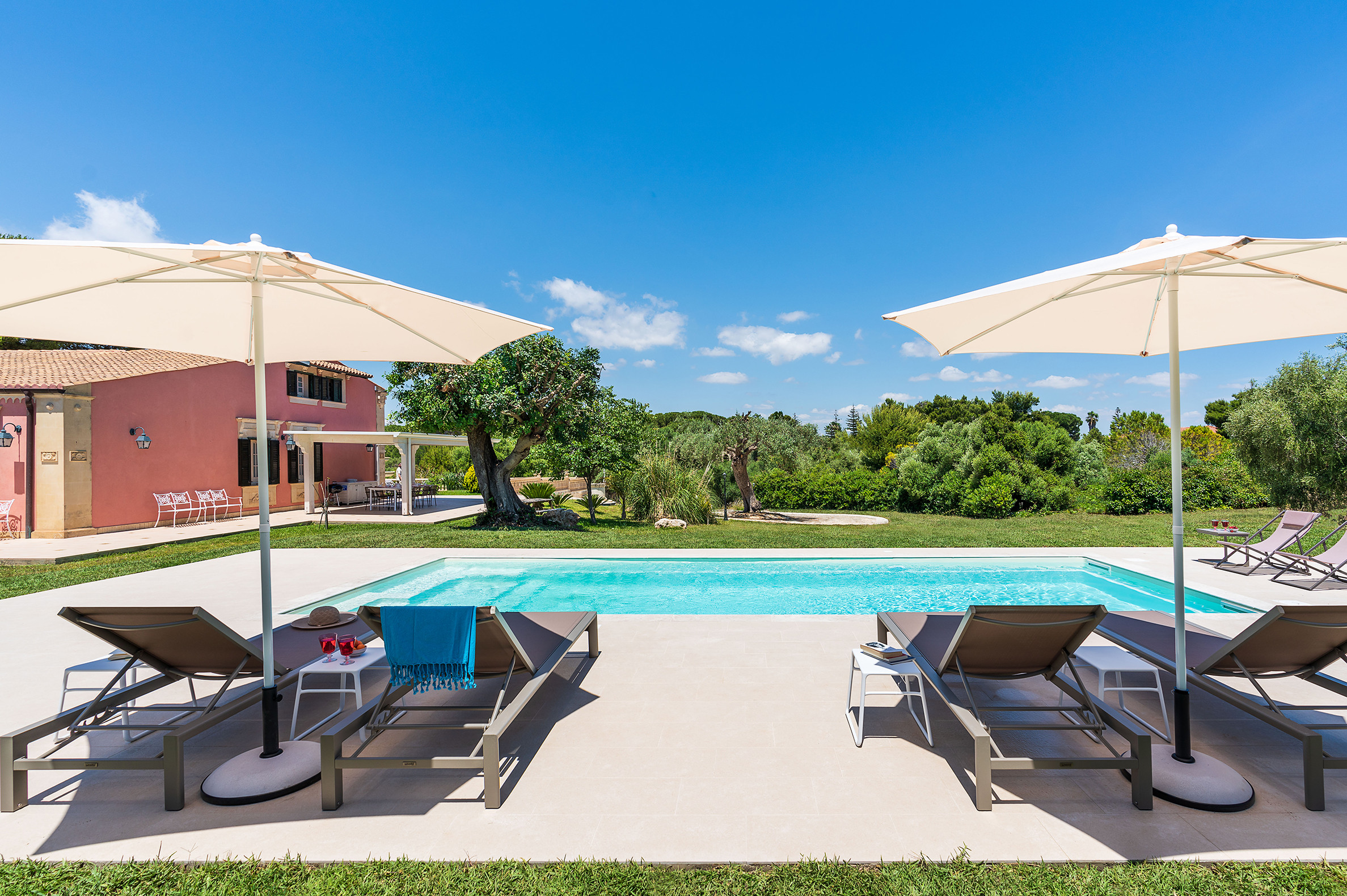 Patio con pergola (barbecue e dining area), terrazze, giardino, piscina, solarium.