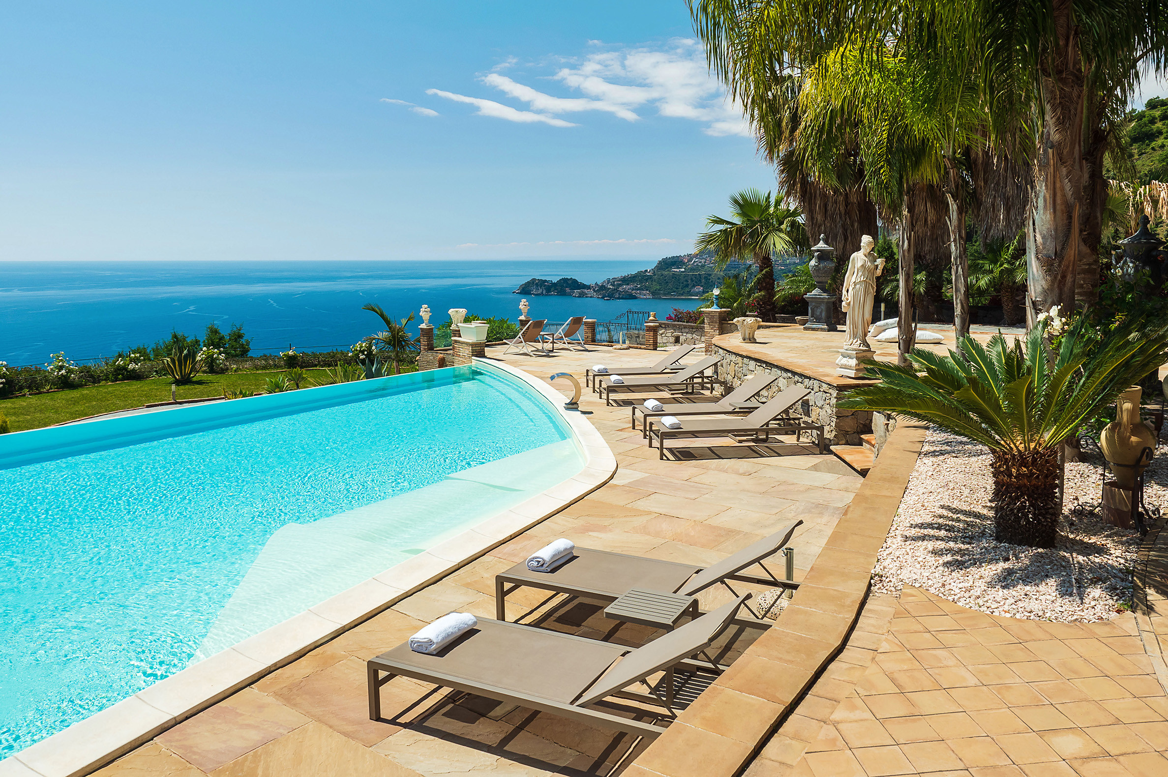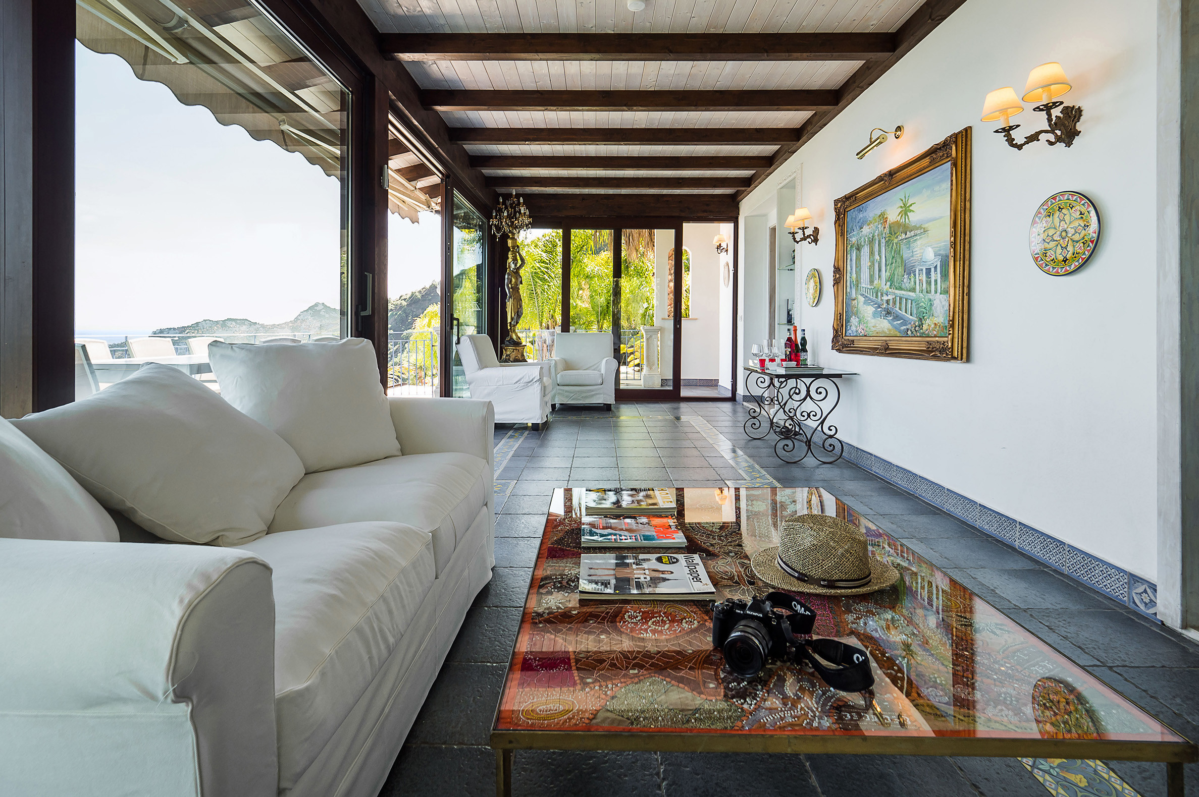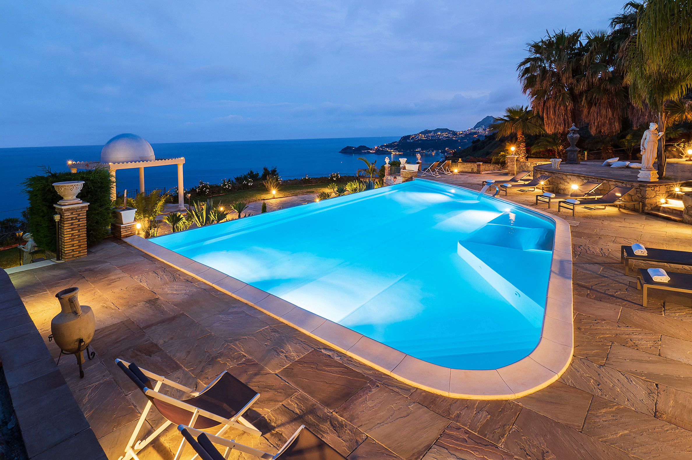 di Taormina. Maestosa ed elegante, la residenza regala un’incantevole vista sul mare e sulla baia di Taormina, bella da ammirare, sia di giorno che di sera, dalla spettacolare piscina a sfioro e dalle sue ampie terrazze attrezzate. Circondata da un grande, curato e rigoglioso giardino, questa splendida villa di recente costruzione offre ambienti interni originali ed accoglienti arredati in una piacevole combinazione di stili, che comprendono uno spazioso soggiorno, una cucina e quattro camere matrimoniali, tutte dotate di bagno privato ed accesso indipendente dalle terrazze. La villa è inoltre dotata di vasca idromassaggio esterna, aria condizionata, internet Wi-Fi, TV satellitare, lavatrice e lavastoviglie. Dalla dimora si possono raggiungere in pochi minuti di auto le vicine spiagge di Letojanni, Mazzarò e dell’Isola Bella, ma anche visitare agevolmente Catania e Siracusa, i paesini del Parco dell’Etna, le gole dell’Alcantara ed i borghi marinari della Riviera dei Ciclopi.