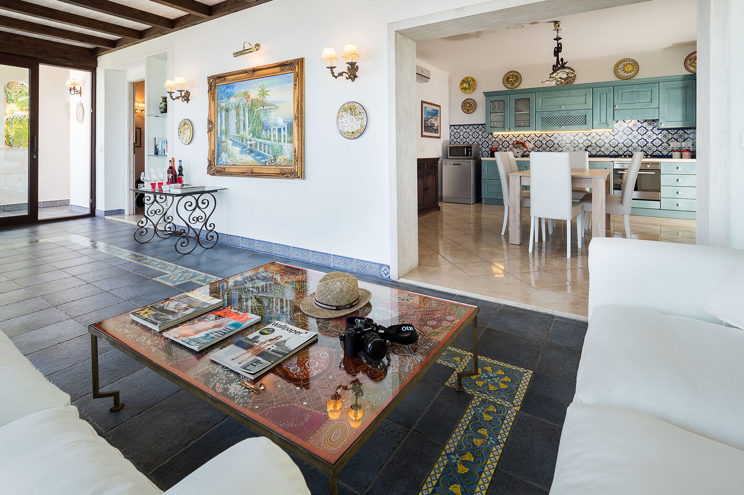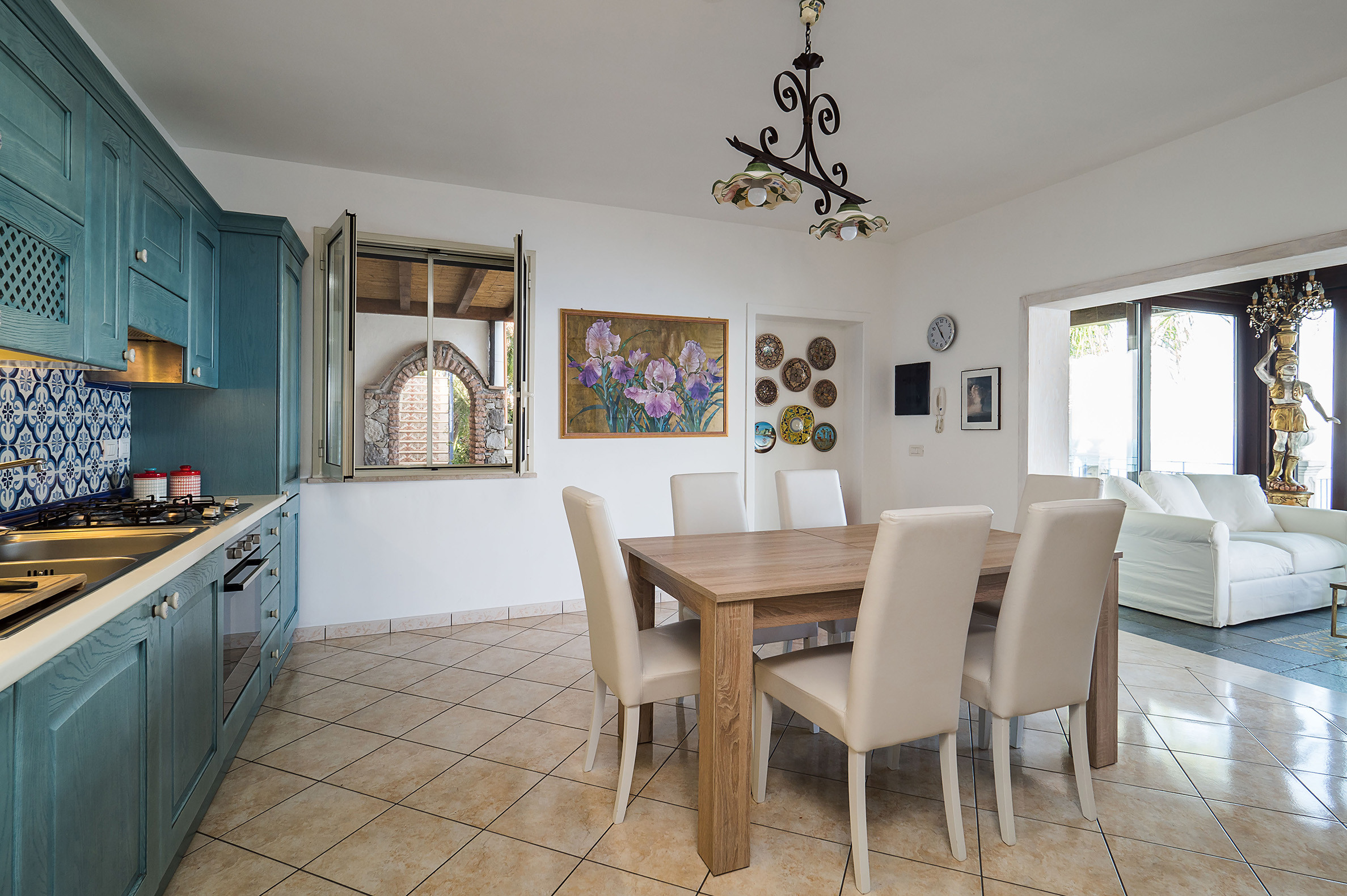 CASA PADRONALE Primo Piano: soggiorno, cucina abitabile, 1 camera matrimoniale con bagno-doccia, terrazza. Piano Terra (con accesso dall’esterno): 2 camere matrimoniali con frigobar e bagno-doccia, lavanderia, terrazza. DEPENDANCE Piano Terra: 1 camera matrimoniale con frigobar e bagno-vasca e doccia.