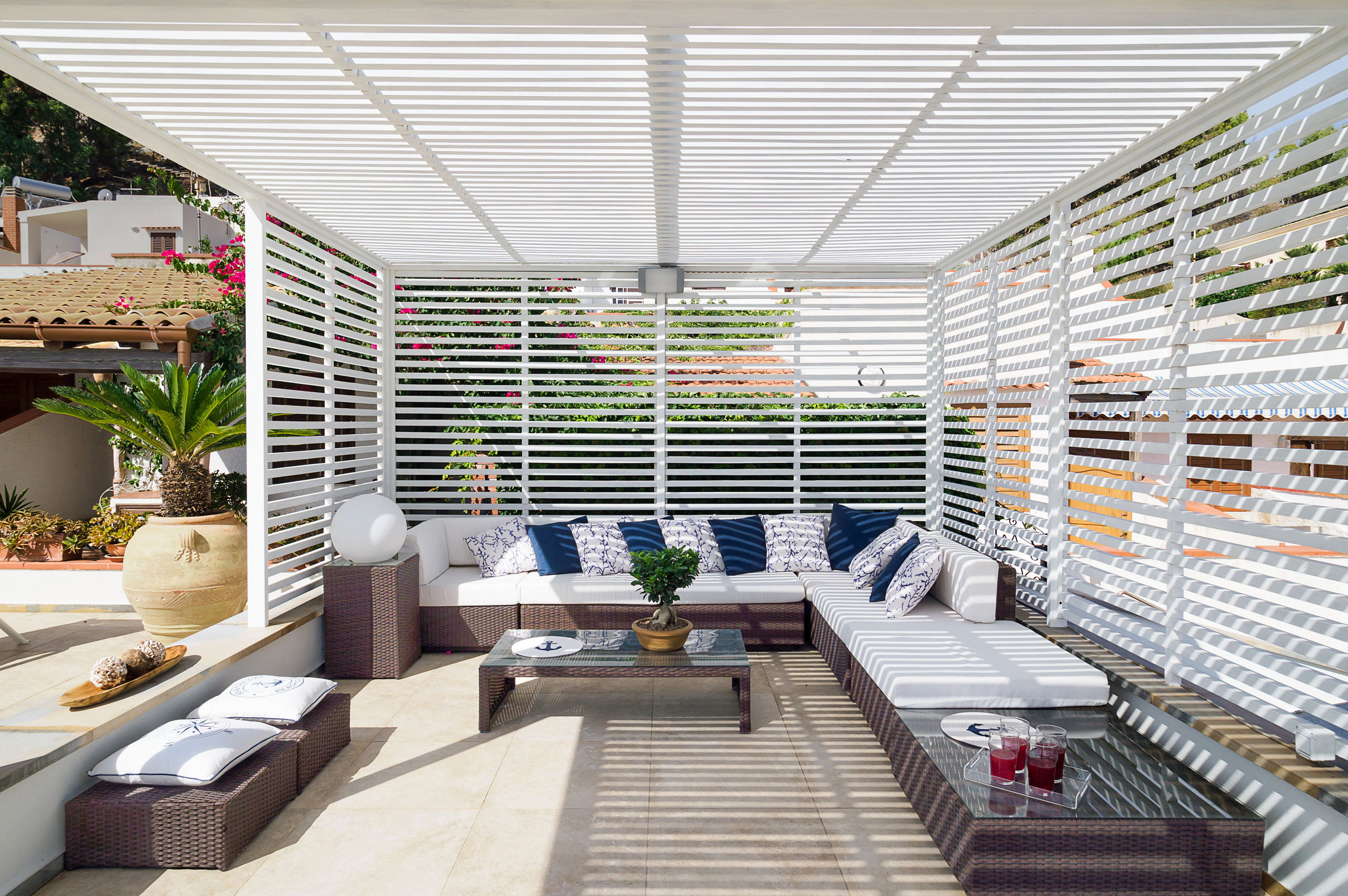 The outdoor area includes a patio with dining area on the ground floor and a large roof terrace on the first floor, accessed by an external staircase, which offers pleasant views over Monte Monaco and the sea.