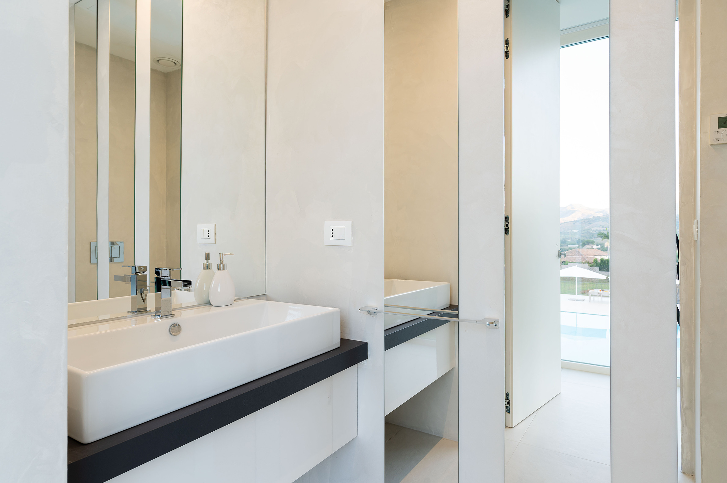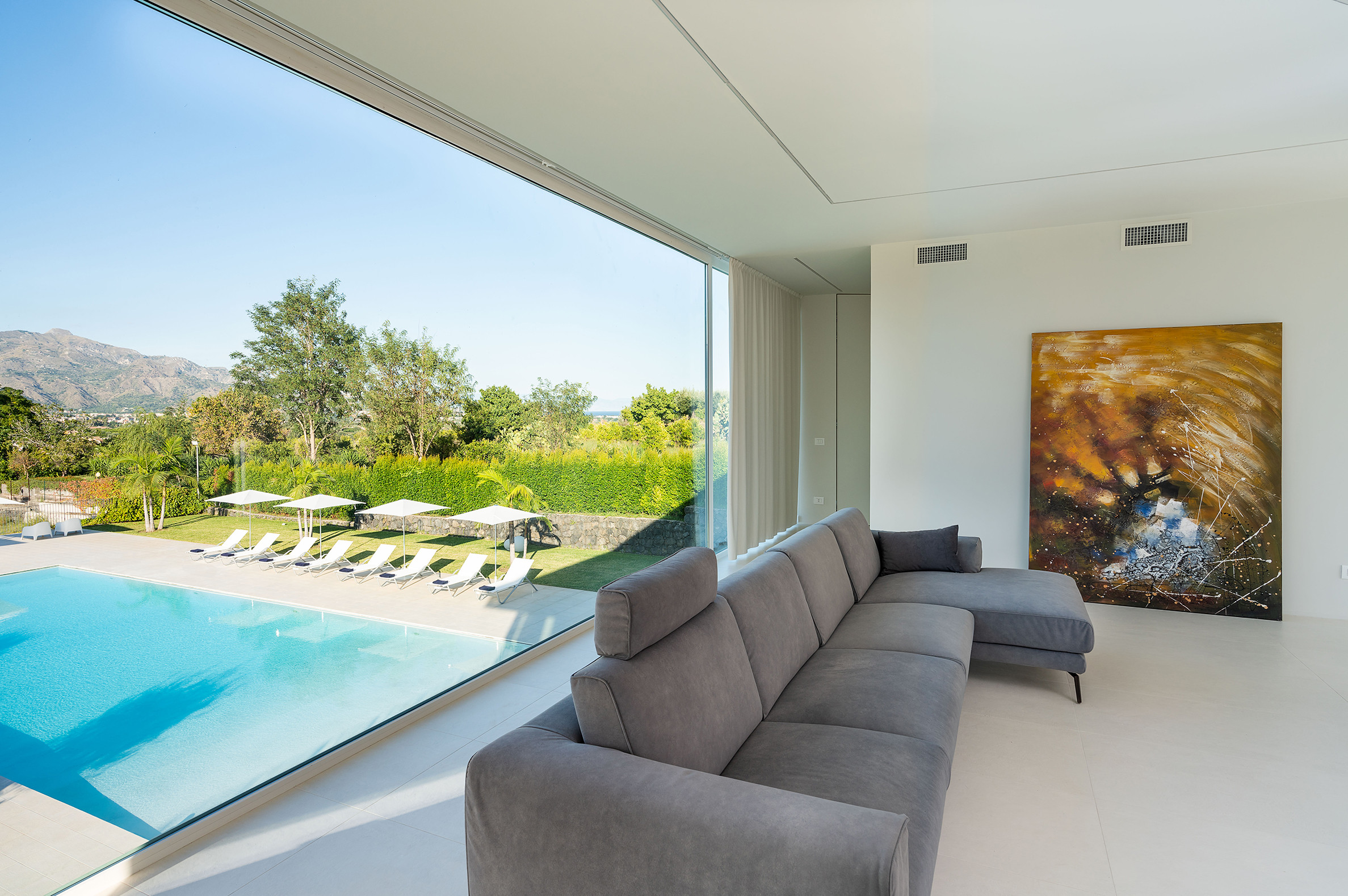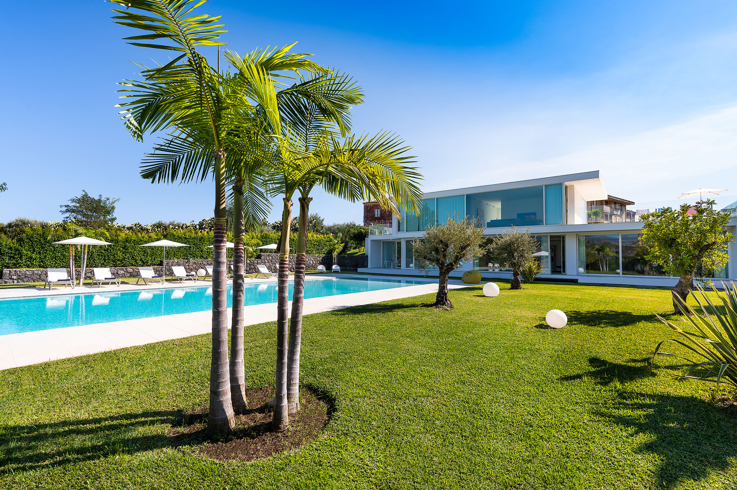 Villa Greta is a luxury villa with private pool situated near Taormina. Ideal retreat for those looking for a comfortable, relaxing stay, this property is surrounded by a wonderful garden with lawn and offers spacious terraces, a large swimming pool (m 8 x 21) and a Jacuzzi. This exclusive, newly built contemporary villa consists of a main house and an annex. Set on two levels, the manor house features bright, cosy interiors that with large glass doors open onto the garden and the surrounding landscape. On the ground floor it includes a living area with kitchen, a luxury suite with a double bed, in-room Jacuzzi tub and bathroom, two double bedrooms with en-suite bathroom and a fourth bathroom with shower. The first floor, accessed through an external staircase, includes another living/dining room with kitchen, a double bedroom with en-suite bathroom, a twin bedroom and a guest bathroom. In the annex there are a living room with kitchenette, two bedrooms and two bathrooms. The villa also has a wellness area with sauna and a treadmill and a number of other amenities, such as A/C, internet Wi-Fi, 8 TVs, satellite receiver, dryer, 2 washing machines, 2 dishwashers, safe and bbq. From Villa Greta can be reached in a few minutes’ drive Taormina’s evocative historic centre and the sea. In the vicinity can be reached the beaches of Fondachello and Giardini Naxos, the Etna’s Park, the Alcantara gorges, the fishing villages on the Cyclops Riviera, Catania and Syracuse.